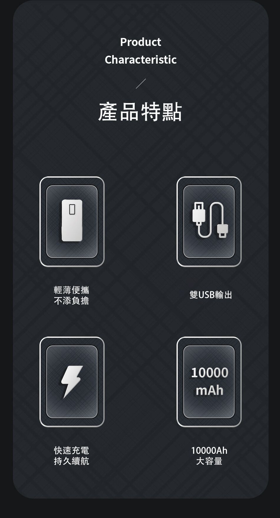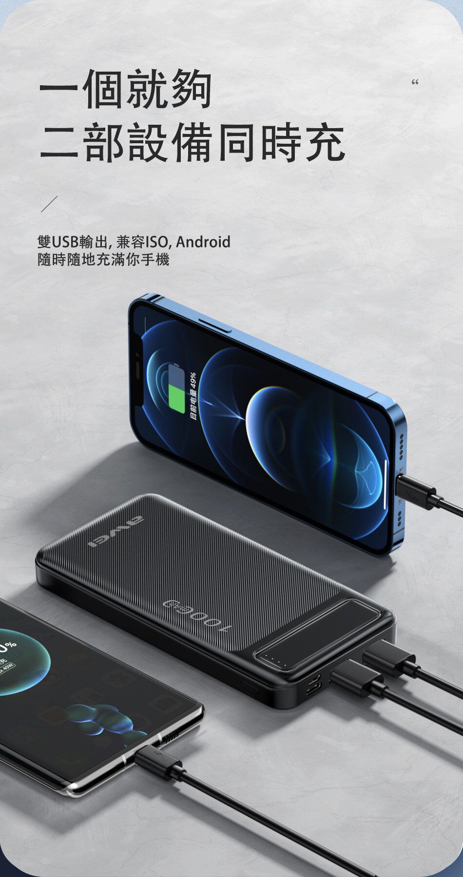 ●10000mAh 電芯容量, 約可充滿2次手機設備