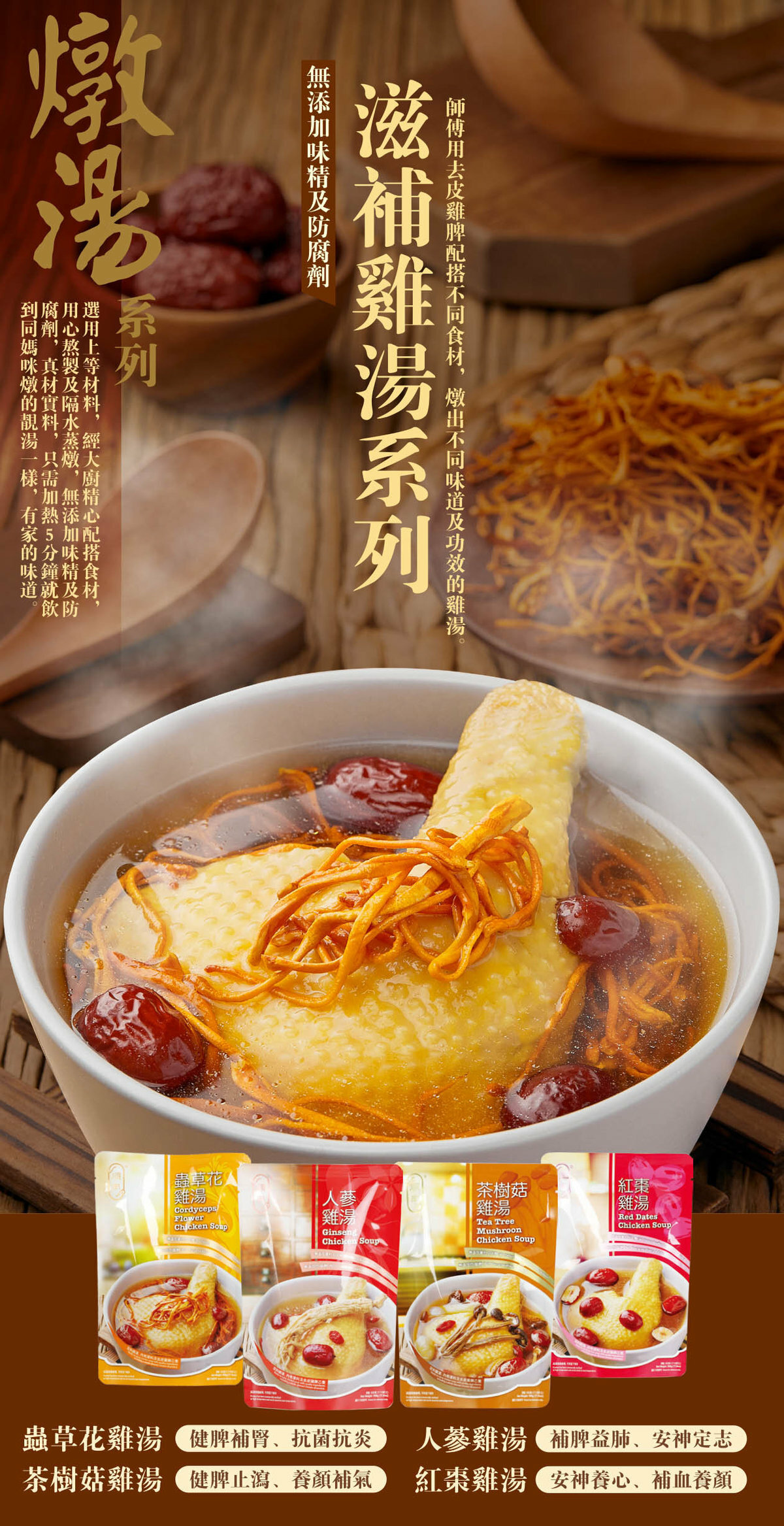 原隻去皮雞髀 及 大份量配料燉製,入口已知真才實料。款款味道不同,非預製湯底的湯包可比。 湯渣湯料比其他品牌多一倍。