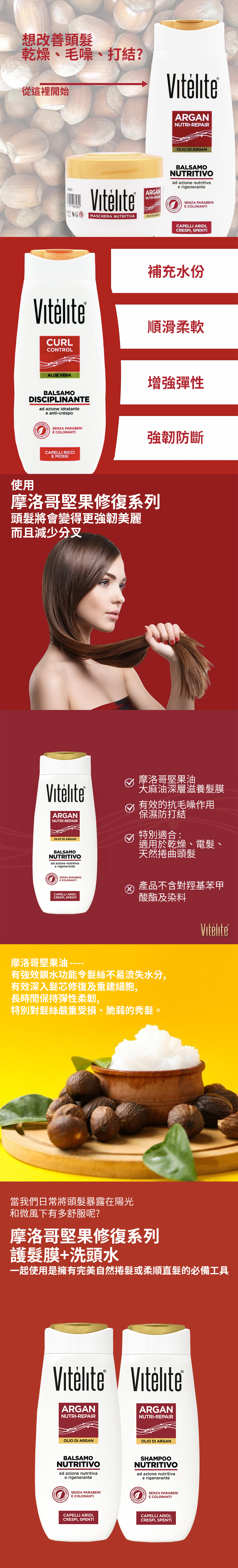 Vitlite 滋養護髮素含有摩洛哥堅果油,非常適合深層滋養頭髮纖維並再生保護頭髮的水脂膜。
