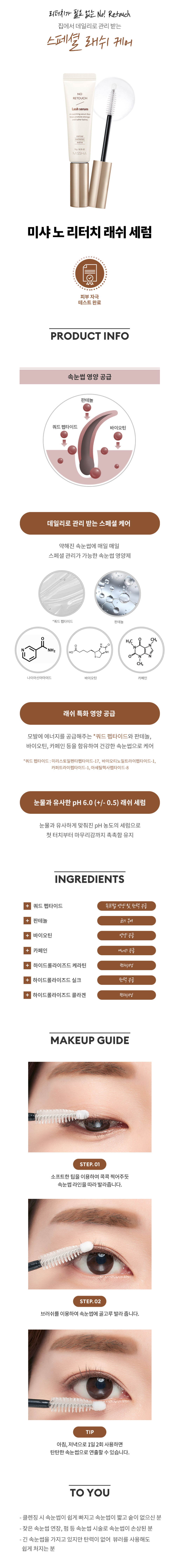 MISSHA No Retouch Lash Serum透明睫毛重塑液,蘊含泛醇、生物素和勝肽,令睫毛濃密、柔軟、有光澤。