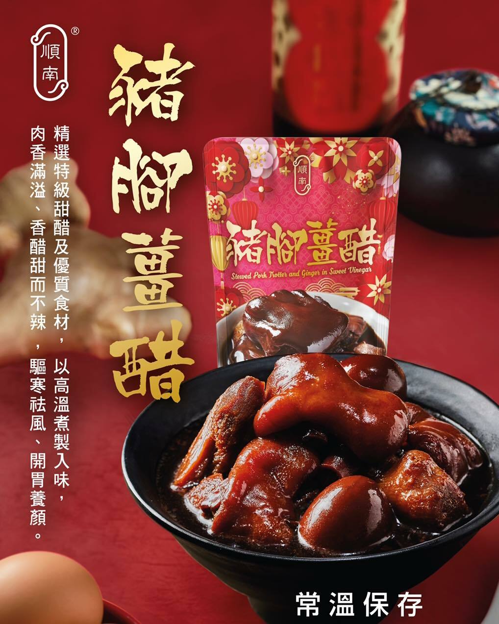 既是媽媽產後必備佳品, 亦是男女老幼喜愛的一道美食,順南選用特級甜醋及供港農場食材,以傳統廚藝炮製,肉香滿溢、香醋甜而不辣, 驅寒祛風、開胃養顏。